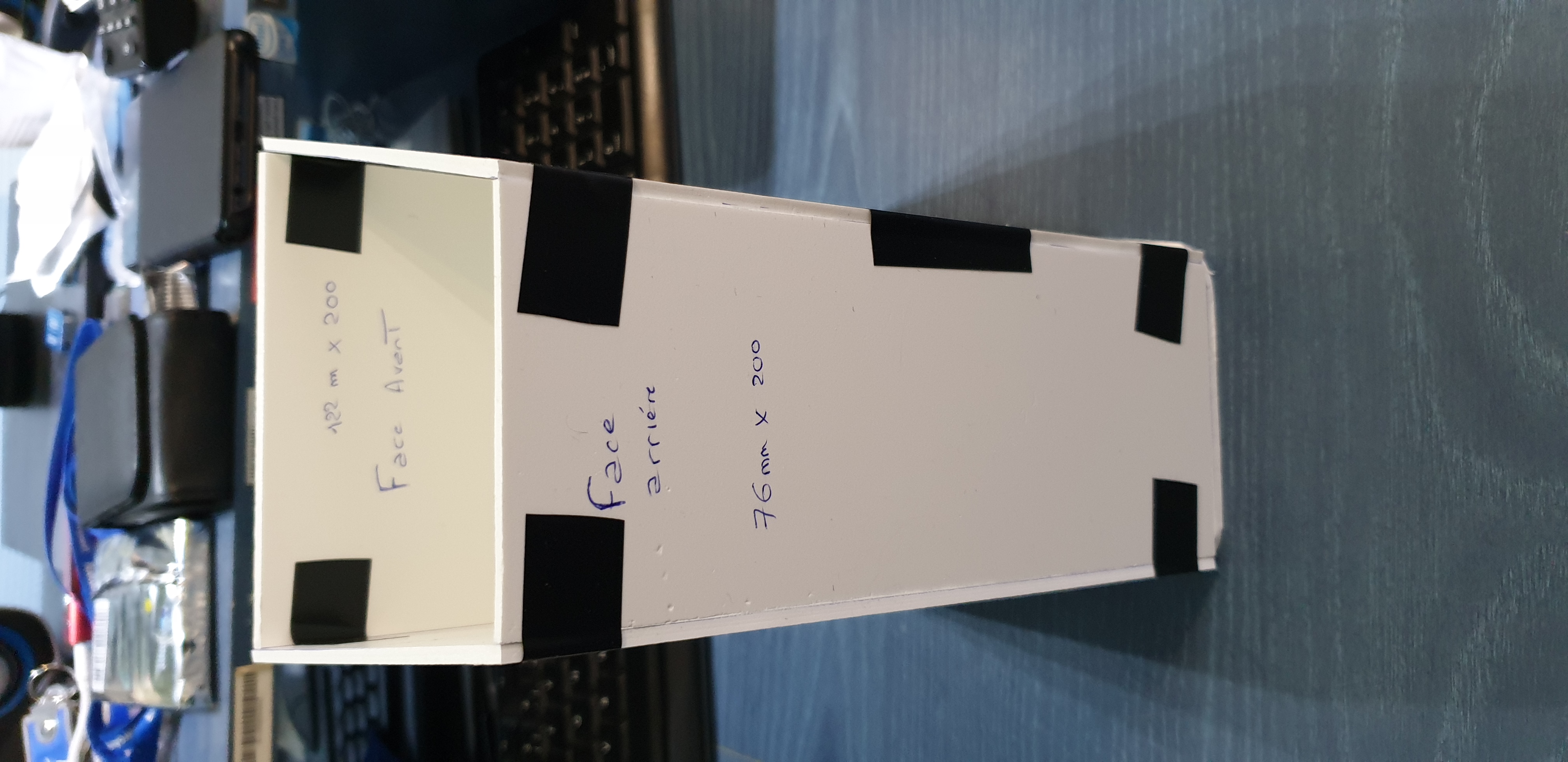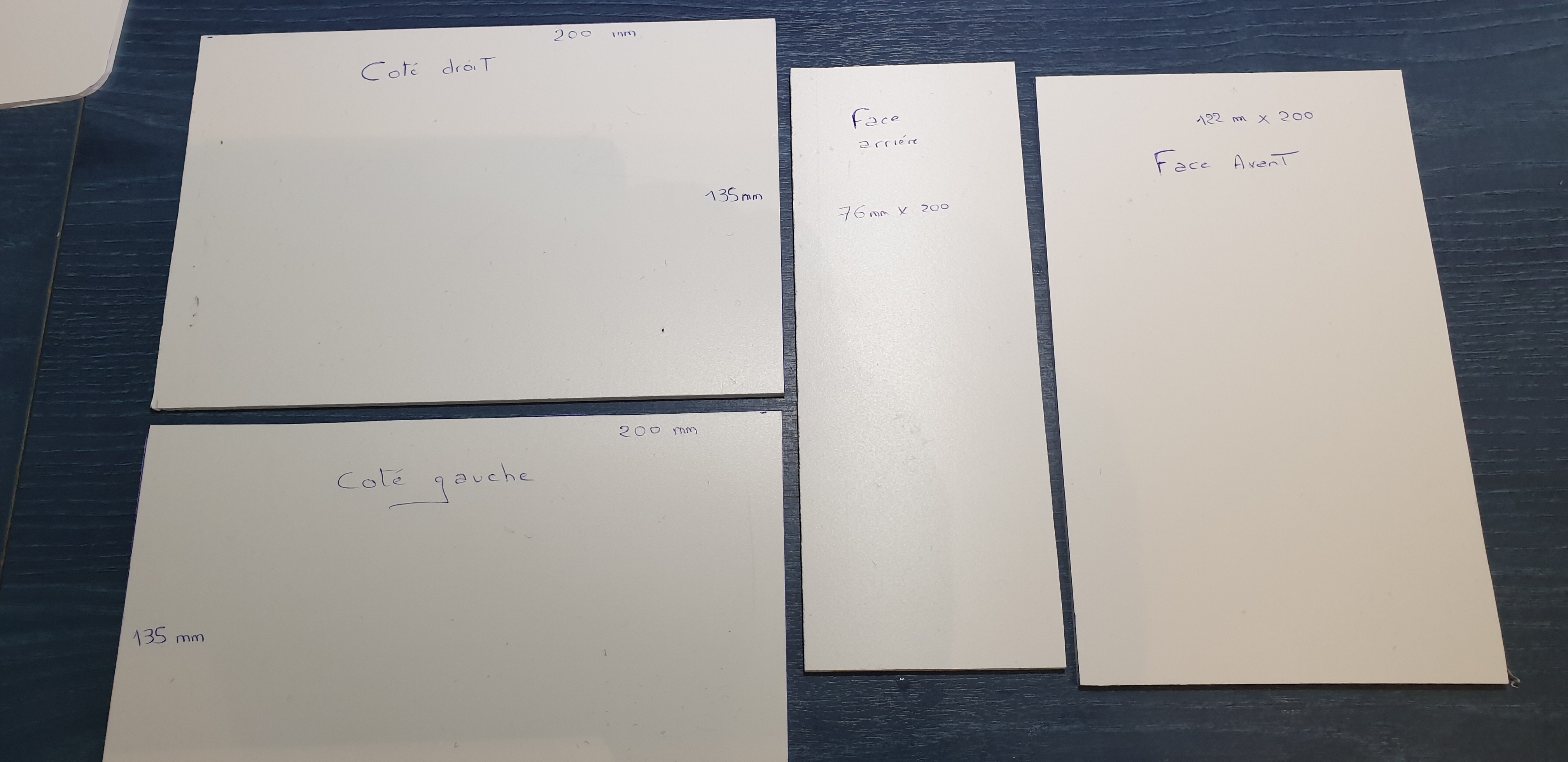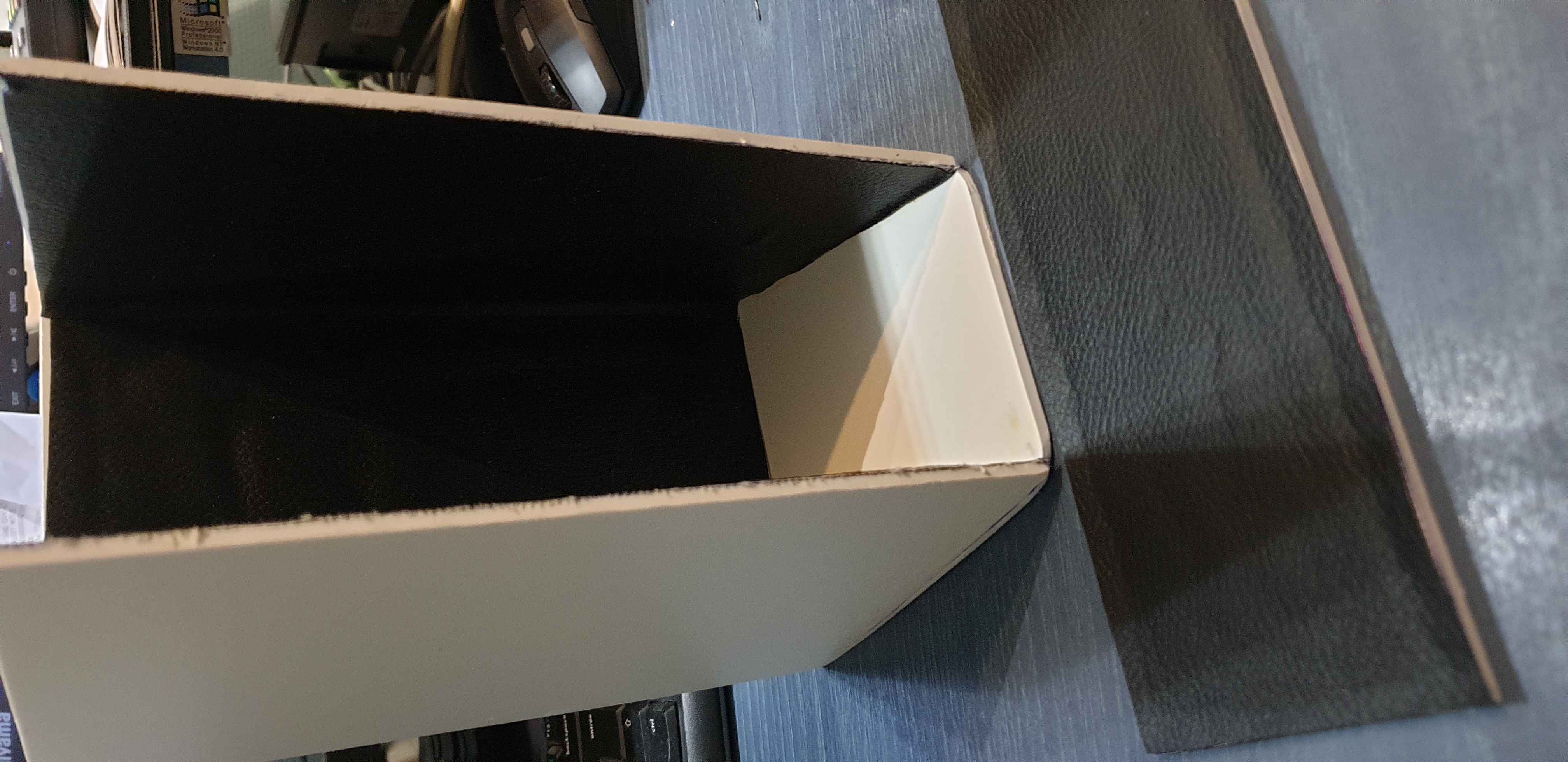 J'ai prévu d'en fabriquer une seconde pour le coté droit ( les deux cotés sont identiques ), j'ai la carte plastique, j'ai la colle, j'ai le simili cuir ( 8 € chez mondial tissus ) mais malheureusement j'ai aussi la Covid ( Omicron depuis deux jours )donc j'essayerai de faire quelque chose de cohérent quand j'aurai retrouvé l'usage de mes neurones et de mes bras, le soucis c'est que la forme est vraiment biscornue, la base part en s'évasant vers le haut sur les 4 faces donc les ajustements demandent du temps et de la minutie.