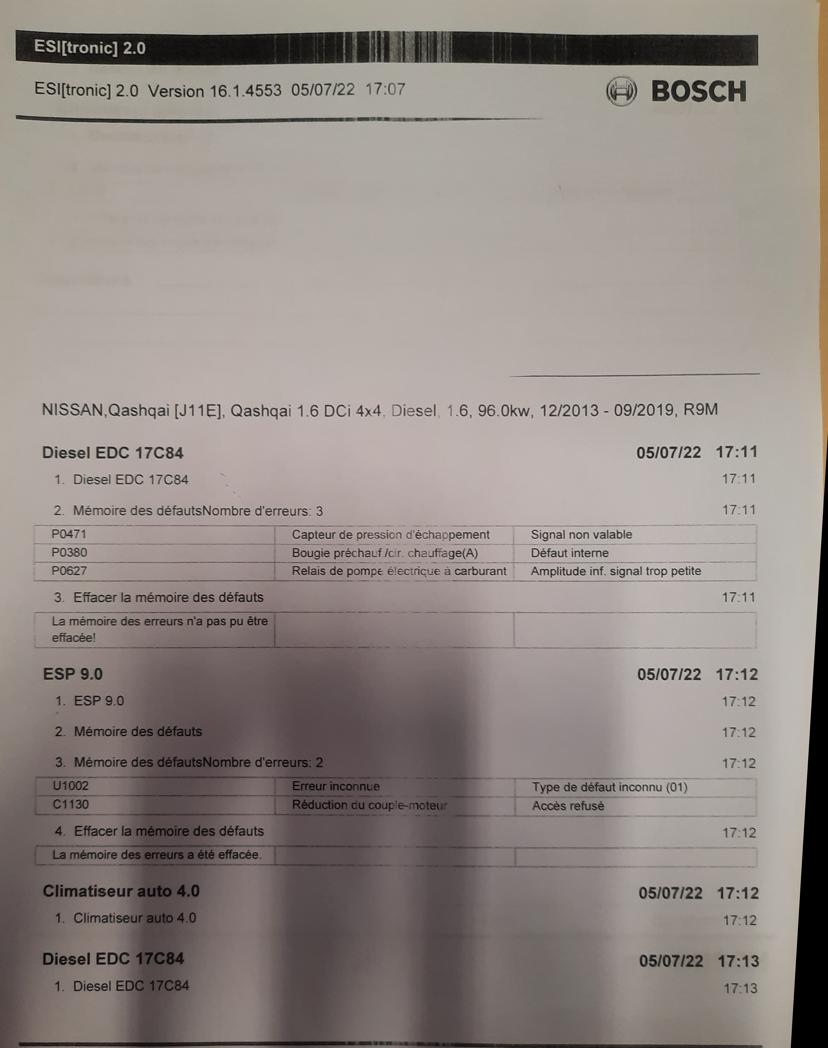 Au sujet des défauts qui n'ont pas pu être effacés. Concernant l'ESP 9.0. Deux codes. U1002 et C1130. Coté Diesel EDC17C84. Trois codes: P0471, P0380 et P0627.